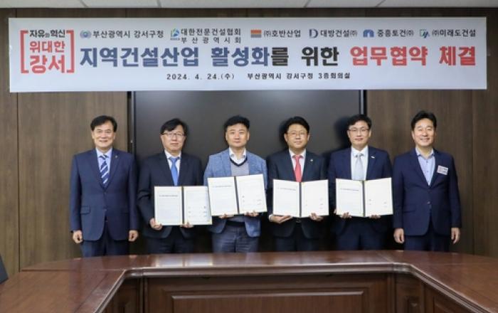 부산 강서구는 4월 24일 에코델타시티 내 주택·건축사업장 관계자를 초청, '지역 건설산업 활성화를 위한 업무협약식 및 간담회'를 개최했다. 이날 행사에는 김형찬 강서구청장, 김세원 대한전문건설협회 부산광역시회장, 에코델타시티 내 주택·건축사업장 시공사(11개 사)