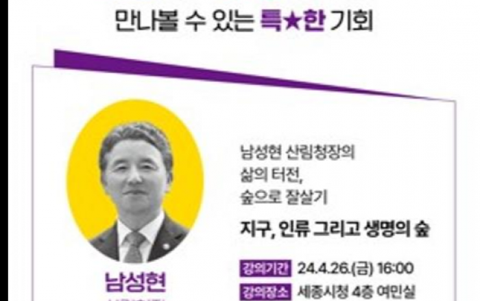 세종특별자치시가 오는 26일 오후 4시 시청 4층 여민실에서 남성현 산림청장 초청 특별강연을 진행한다. 이번 특별강연은 산림의 역할과 가치증진 등 산림의 소중함을 되새기고 세종시 산림·정원정책 발전 방향 등 이야기를 나누기 위해 마련됐다.
