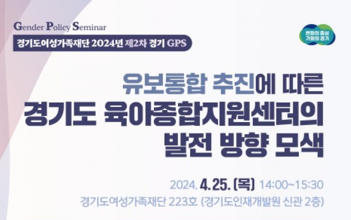 경기도여성가족재단이 유보통합 추진에 따른 경기도 광역 육아종합지원센터의 발전 방향을 논의하기 위해 25일 재단 회의실에서 제2차 경기GPS(Gender Policy Seminar)를 개최한다. 이날 행사에서는 연구결과를 토대로 향후 경기도