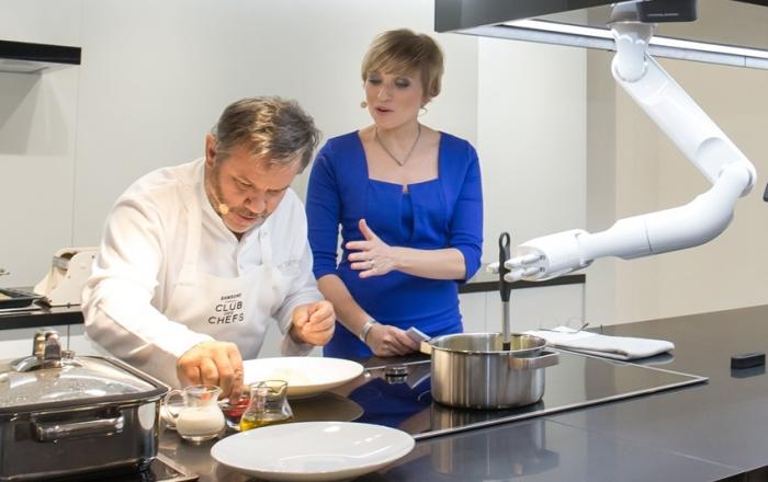 삼성전자가 독일 베를린에서 6일부터 11일까지 열리는 유럽 최대 가전 전시회 ‘IFA 2019’에 참가해 삼성 클럽 드 셰프와 삼성봇 셰프가 협업해 요리하는 시연을 선보이고 있다. ‘삼성봇 셰프’는 로봇 팔에 다양한 도구를 바꿔 장착함으로써 식재료를 자르고 섞거나 양념