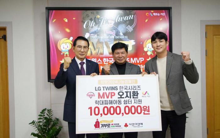LG트윈스 오지환 선수가 12월 15일 충남 서산시청을 방문하여 학대피해아동 쉼터에 지원금 1,000만 원을 전달했다. 오지환 선수는 “두 아들의 아버지로서 부친에게서 학대피해아동쉼터에 대한 얘기를 듣고 조금이나마 보탬이 됐으면 하는 마음에 기부를