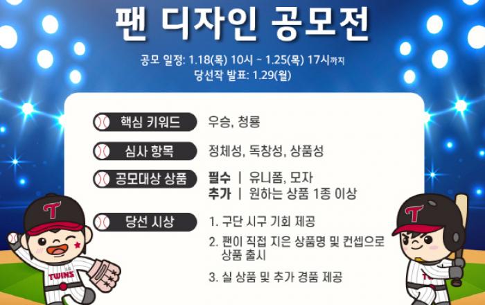 서울 LG트윈스는 오는 18일 오전 10시부터 25일 오후 5시까지 ‘2024 팬 디자인 공모전’을 진행한다. 팬 디자인 공모전은 팬들이 직접 구단 상품을 기획하고, 투표하는 팬 참여 이벤트이다. 2023년 당선작 LG트윈스 ‘데님에디션’ 기획은 상품으로 출시되어 좋은