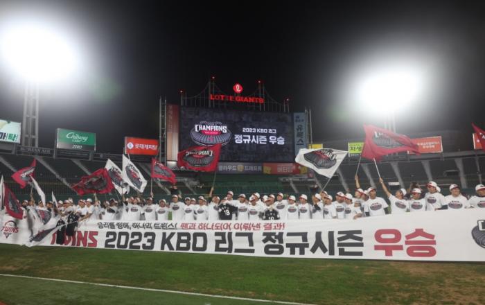 서울 LG트윈스는 10월 3일(화) 2023시즌 정규리그 우승 엠블럼을 공개했다. 3일 경기가 없던 LG트윈스는 82승 51패 2무(승률 0.617)를 기록하며 9경기를 남겨놓고 매직넘버를 지웠다. 이는 1994년 이후 29년만에 세번째 정규리그 우승이다.