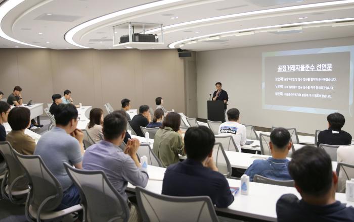 현대카드가 ‘2024년 공정거래 자율준수 선언식’을 열었다고 14일 밝혔다. 공정거래 자율준수 선언식은 현대카드 임직원들이 한 자리에 모여 공정거래 실천 의지를 다지기 위해 마련된 행사다. 올해 처음으로 열린 이번 행사에서는 김덕환 대표 등 임직원 40여