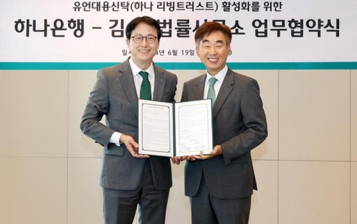 하나은행은 지난 19일 서울 강남구 삼성동에 위치한 '하나 뉴시니어 라운지'에서 김·장 법률사무소 (이하 '김앤장') 와 유언대용신탁 활성화를 위한 전략적 업무협약(MOU)을 체결했다고 밝혔다. 이번 업무협약은 하나은행과 김앤장이 유언대용신탁 업무를 수행하면서 발생