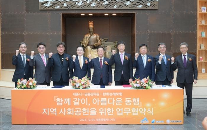 세종특별자치시와 금융감독원, 한화손해보험이 협력해 금융사기 피해 예방 및 저출산 위기 극복 등 지역 사회공헌을 전개하기로 뜻을 모았다. 시는 4일 시청 책문화센터에서 최민호 시장과 이복현 금융감독원장, 나채범 한화손해보험 대표이사가 참여한 가운데 지역 사회공헌을 위