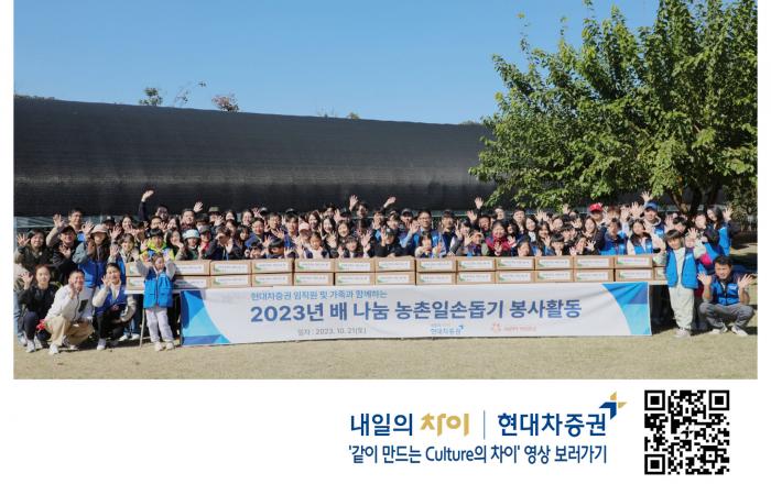 현대차증권은 지난 21일 경기도 안성에서 임직원 및 가족 참여 ‘농촌일손돕기 배 수확 봉사활동’을 진행했다고 23일 밝혔다. 이번 봉사활동은 현대차증권이 추진하고 있는 ‘ESG 경영’의 일환으로 마련됐다. 본격적인배 수확기임에도 일손 부족