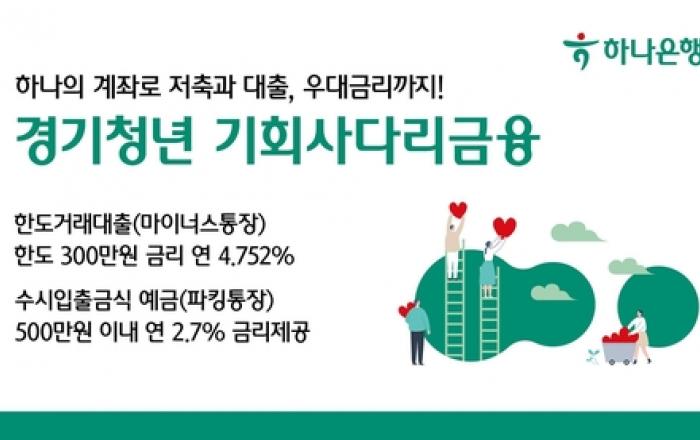 하나은행은 경기도와 협약을 통해 경기도에 거주하는 25∼34세 청년을 대상으로 하나의 계좌에서 저금리 대출과 저축 금액에 대해 우대금리도 적용해주는 '경기청년 기회사다리금융 통장'을 판매한다고 밝혔다. 이번에 새롭게 판매하는 '경기청년 기회사다리금융 통장'은 지난