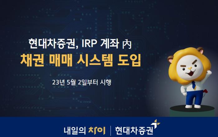 현대차증권은 5월 2일부터 IRP 가입자를 대상으로 계좌 내 채권 매매서비스를 제공한다고 2일 밝혔다. 이번 채권 매매 서비스 도입을 통해 현대차증권 IRP 가입자들은 개인 투자성향에 따른 운용 지시로 채권에 직접 투자할 수 있게 되었다.