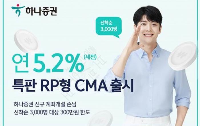 하나증권은 세전 연 5.2%의 수익률이 적용되는 온라인 전용 특판 CMA(RP형)를 출시했다고 15일 밝혔다. 특판 CMA는 하나증권 모바일 웹 이벤트 페이지, 페이코앱을 통해 최초로 계좌를 개설해 CMA를 가입하는 선착순 3,000명 손님을 대상으로 판매하며, 한