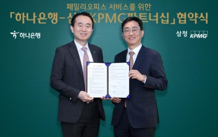 하나은행은 지난 23일 오후 서울 용산구 한남동 소재 하나은행 「Club1(클럽원) 한남」에서 회계/경영컨설팅 전문 기업 삼정KPMG(회장 김교태)와 VVIP 손님의 패밀리오피스 서비스 강화를 위한 업무협약을 체결했다고 밝혔다. 하나은행은 이번 업무협약을 통해 패밀