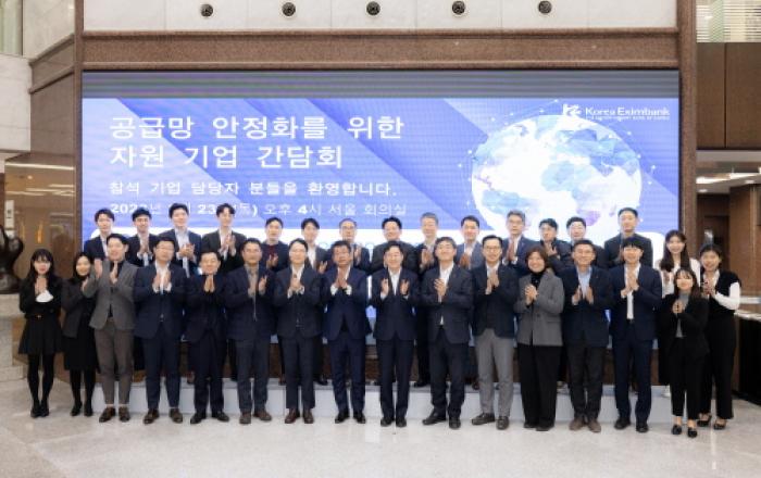 한국수출입은행(이하 '수은')은 23일 오후 수은 본점에서 국내외 주요 해외자원 기업과 관계기관을 초청해 '공급망 안정화를 위한 자원 기업 간담회'를 개최했다고 24일 밝혔다. 이 자리에는 국내 주요 자원기업 17개사의 재무·원료수급 담당 임직원 25명이 참석했다.