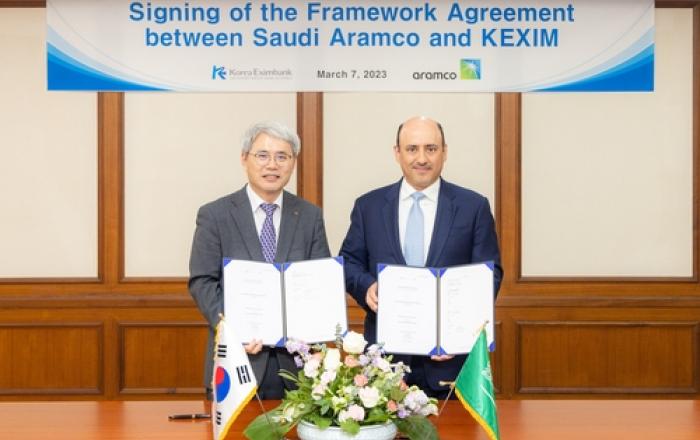 한국수출입은행(이하 '수은')은 7일 사우디아라비아 국영 에너지기업 아람코(Aramco)와 향후 3년간 60억달러 규모의 기본여신약정(Framework Agreement)을 체결했다고 밝혔다. 윤희성 수은 행장과 지야드 알마르셰드(Ziad Al-Murshed) 사우