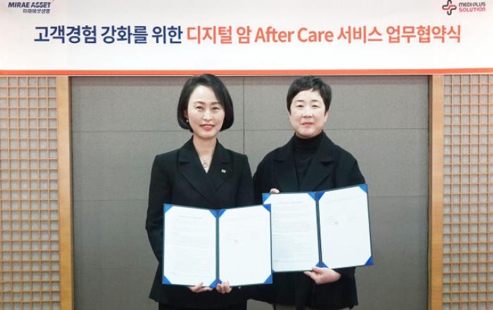 미래에셋생명과 메디플러스솔루션이 암 발병 고객을 대상으로 애프터케어(After-Care) 서비스를 제공하기 위해 손을 잡았다. 미래에셋생명은 25일, 서울 여의도 미래에셋생명 본사에서 메디플러스솔루션과 전략적 업무협약(MOU)을 체결하면서 암보험 관련 헬스케어 프로그램