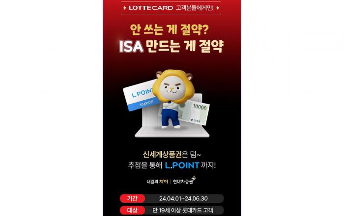 현대차증권은 4월 1일부터 6월 30일까지 롯데카드 회원을 대상으로 중개형 ISA 계좌 개설 이벤트를 진행한다고 1일 밝혔다. 이벤트 자격은 롯데카드 고객 중 이벤트를 신청하고 이벤트 기간 내 현대차증권 중개형 ISA 계좌를 최초 개설한