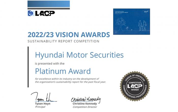 현대차증권이 발간한 〈현대차증권 2023 지속가능경영 보고서〉가 미국커뮤니케이션연맹(LACP, League of American Communications Professionals) 주최 ‘2022/23 비전 어워즈(Vision Awards)’에서 대상(Platinum