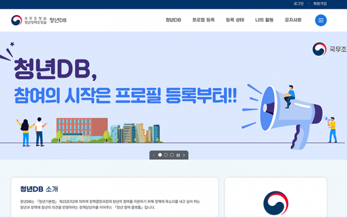 정부 정책에 참여하고 싶은 2030 청년이라면? 정부 정책 수립에 청년들의 목소리가 필요한 정책 담당자라면? 이들을 이어주는 쌍방향 매칭 플랫폼 ‘청년DB’가 있다. 청년DB는 ‘청년기본법’ 제15조의2에 의해 정책결정과정에 청년의 참여를 지원하기 위해 마련됐다.