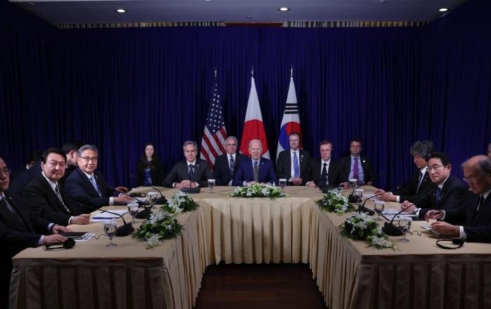 동남아를 순방 중인 윤석열 대통령은 13일(현지시간) 캄보디아 프놈펜에서 조 바이든 미국 대통령, 기시다 후미오 일본 총리와 한미일 정상회의를 갖고 북핵문제, 경제안보, 지역 및 글로벌 현안 관련 3국 간 협력 방안에 관해 협의했다고 대통령실이 밝혔다. 특히 3국