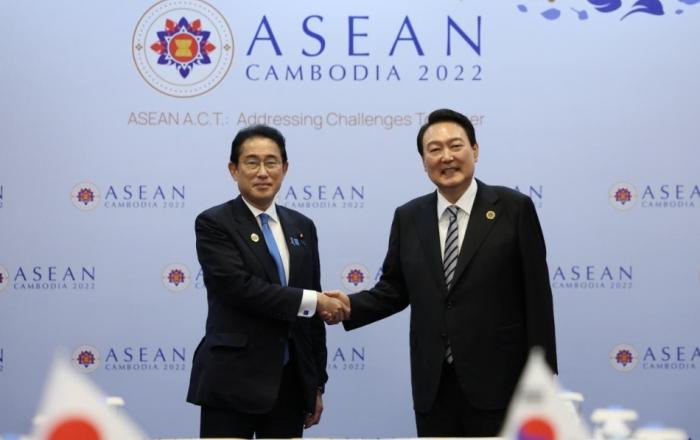캄보디아를 방문 중인 윤석열 대통령은 13일(현지시간) 기시다 후미오 일본 총리와 약 45분간 한일 정상회담을 가졌다고 대통령실이 전했다. 회담 시작에 앞서 기시다 총리로부터 이태원 사고 관련 유가족과 한국 국민에 대한 애도 표명이 있었고, 윤 대통령도 2명의 일