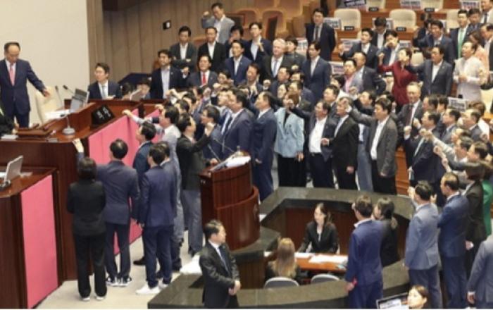 우원식 국회의장이 4일 오후 서울 여의도 국회에서 열린 제415회 국회(임시회) 제5차 본회의에서 '채해병 특검법' 관련 필리버스터(무제한 토론)를 중단하는 표결을 진행하려 하자 국민의힘 의원들이 항의하며 구호를 외치고 있다.대통령 거부권(재의요구권)이 행사된 '채상병