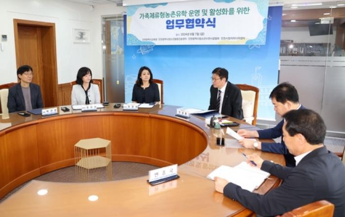 인천광역시교육청은 오는 9월 가족체류형농촌유학 프로그램 운영에 따라 인천광역시청소년활동진흥센터(센터장 지경호), 인천광역시청소년수련시설협회(회장 박건호), 인천시청자미디어센터(센터장 최지안)과 업무협약을 체결했다고 10일 밝혔다. 가족체류형농촌유학 프로그램 운영을