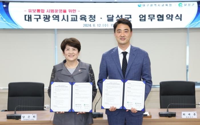 대구시교육청은 6월 12일(수) 15:30 달성군청 상황실에서 강은희 교육감, 최재훈 군수, 김태헌 달성교육지원청교육장 및 각 기관 관계자들이 참석한 가운데 달성군과 유보통합 시범 운영을 위한 업무 협약을 체결한다고 밝혔다. 협약의 주요 내용으로는 ▲보육업무 공동
