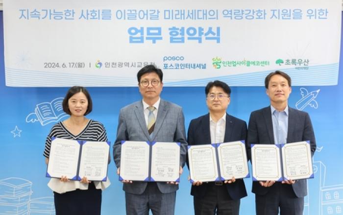 인천광역시교육청은 지속 가능한 사회를 이끌 청소년들의 역량 강화를 위해 포스코인터내셔널(, 초록우산, 인천업사이클에코센터와 지난 17일 업무협약을 체결했다. 이번 협약은 인천 청소년들에게 기후 위기 등 예측 불가능한 미래 변화에 대응하기 위한 탄소중립 프로그램 개발