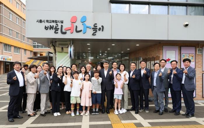 교육부는 올해 학교복합시설 40개를 신규 선정하고 인구감소지역 등에 대해서는 총 사업비의 50%를 지원한다고 10일 밝혔다. 이주호 부총리 겸 교육부장관이 작년 7월11일 경기 시흥시 학교복합시설인 ‘배곧너나들이’를 방문, 관계자들과 기념촬영을 하고 있다.(