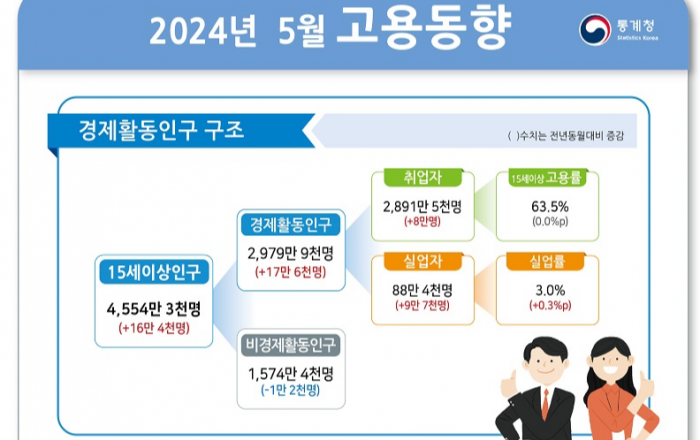 지난달 15~64세 고용률이 사상 최초로 70%를 기록하고, 15세 이상 고용률(63.5%)·경제활동참가율(65.4%) 또한 5월 기준 역대 최고를 기록했다. 취업자 수는 8만 명 증가했는데, 휴일일 석가탄신일이 포함되는 등 일시적 요인 등에 영