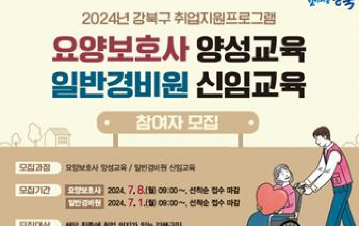 서울 강북구는 구직자의 취업역량을 강화하고 취업 기반 마련을 위한 '2024년 구직자 취업지원 프로그램' 참여자 150명을 모집한다고 13일 밝혔다. 이번 '2024년 구직자 취업지원 프로그램'은 구인 구직 수요가 많은 일반경비원 신임교육 및 요양보호사 양성교육이