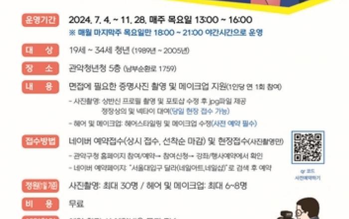관악구가 취업 면접 준비에 실질적으로 도움을 줄 수 있도록 '청년 면접이미지 컨설팅 스튜디오'를 운영한다. 스튜디오에서는 청년들의 경제적 부담을 덜기 위해 면접에 필요한 사진 촬영, 헤어스타일링, 메이크업 서비스가 전액 무료이다. 사진 촬영은 이력서용 상반신