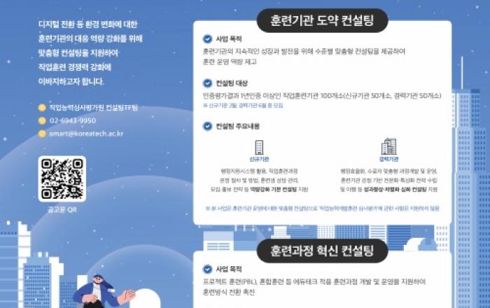 고용노동부와 직업능력심사평가원은 2월 16일(금), 훈련기관이 디지털 전환 등 다양한 환경변화에 대응하면서 높은 품질의 훈련을 제공할 수 있도록 ‘직업훈련 혁신 컨설팅’을 추진한다고 밝혔다. 이를 위해 100여 명의 직업훈련 전문가, 우수 훈련기관 관계자 등으로