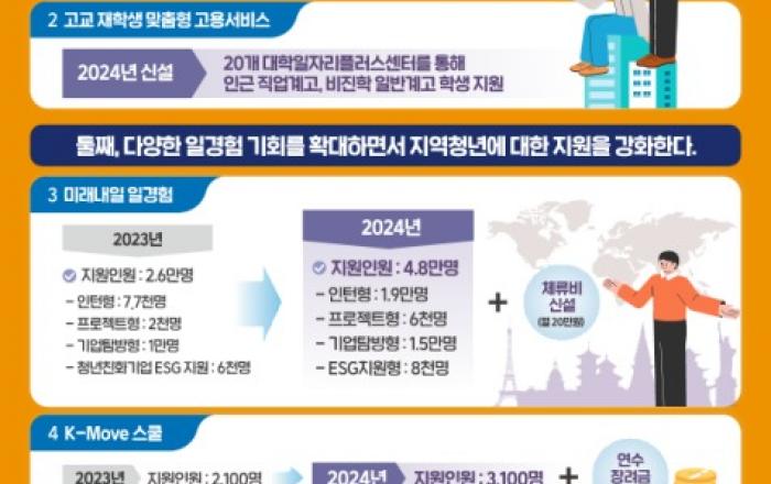 고용노동부는 2024년 청년일자리 사업을 통해 ‘재학-구직-취업’ 단계별 상황에 맞춰 청년들이 원하는 맞춤형 지원을 강화한다. 2024년 달라지는 청년일자리 10대 사업을 다음과 같이 소개한다. 첫째, 더 많은 학생들에게 맞춤형 고용서비스를 제공한다. ① ‘