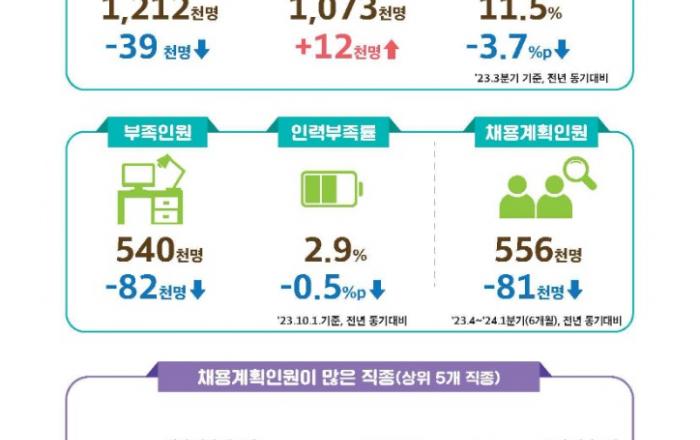 구인, 채용 및 미충원인원(’23.3분기) (구인·채용) ’23.3분기 종사자 1인 이상 사업체의 구인인원은 1,212천명으로 전년동기대비 39천명(-3.1%) 감소, 채용인원은 1,073천명으로 12천명(+1.1%) 증가 (미충원) ’23.3분기 미충원인원은