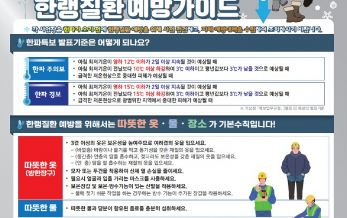 고용노동부와 한국산업안전보건공단은 한파에 따른 건강장해를 예방하기 위해 12.21.(목) 「한파 대응 특별 현장점검의 날」로 지정하고 산업현장을 일제 점검한다. 지난주부터 한파에 따른 강추위가 계속되고 있어, 한파에 취약한 건설현장 등 야외근로자에 한랭질환 발생이 우