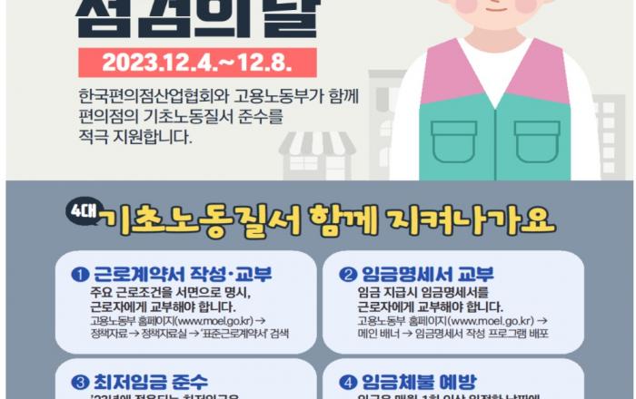 고용노동부는 겨울방학 등을 앞두고 청년 등 취약계층이 주로 종사하는 편의점을 대상으로 12월 4일부터 1주간 기초노동질서 준수 분위기 확산을 위한「현장 예방점검의 날」을 운영한다고 밝혔다. 이번 현장 예방점검의 날은 주로 소규모 가맹점으로 노무관리 여력이 부족한 편