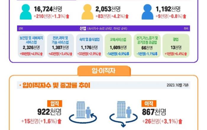 종사자(’23.10월 말) (총괄) ’23.10월 마지막 영업일 현재, 종사자 1인 이상 사업체의 종사자는 19,969천명으로 전년동월(19,667천명)대비 303천명(+1.5%) 증가 주요 특성별 (종사상지위별) 상용근로자는 전년동월대비 210천명