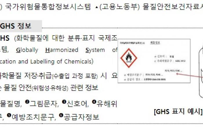 소방청과 고용노동부는 양 기관에서 개별적으로 운영 중인 ‘화학물질 정보제공 시스템’의 중복된 화학물질 4,041종 중 GHS 정보가 다른 393종에 대한 정보 통일화 작업을 완료했다고 밝혔다. 그동안 동일한 화학물질에 대해 부처별로 운영하는 ‘화학물질 정보제공 시스