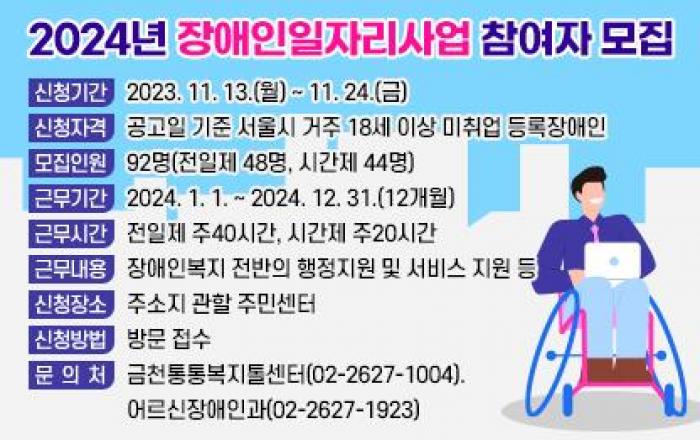 금천구는 2024년 장애인일자리사업 참여자를 모집한다고 밝혔다. 장애인일자리사업은 취업 취약계층인 장애인의 소득을 보장하고, 사회참여를 확대하기 위해 맞춤형 일자리를 제공하는 사업이다. 모집인원은 일반형 일자리 92명(전일제 48명, 시간제 44명), 복지 일