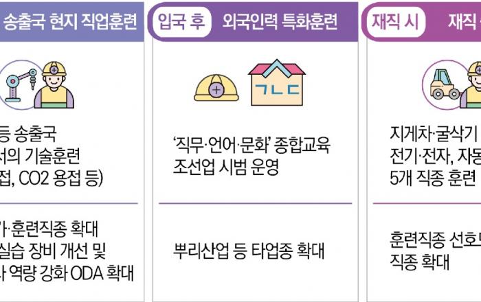 내년부터 송출국 현지 직업훈련 실시 국가, 비전문 외국인력(E-9) 특화훈련 인원, 외국인 재직자 훈련 직종 등이 확대될 전망이다. 이성희 고용노동부 차관은 10월 31일(화), 현대삼호중공업(전남 영암군 소재)을 방문하여 저숙련 외국인력 대상 직업훈련을 실시하는 6개