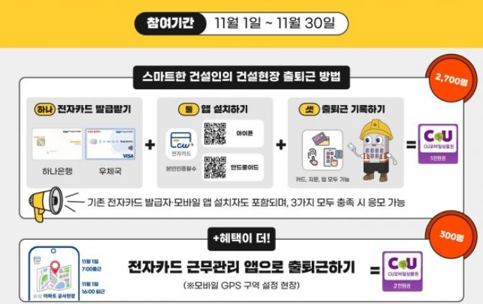 건설근로자공제회(이하 공제회)는 ‘24년 전자카드제 전면 확대 시행을 앞두고 건설근로자를 대상으로 11월 한 달간 전자카드 사용 활성화 이벤트를 진행한다고 1일 밝혔다. 이번 이벤트는 내년부터 퇴직공제 의무 가입 대상 모든 건설공사(공공 1억 원, 민간 50억 원
