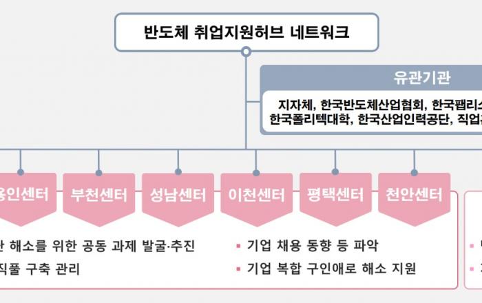 고용노동부는 최근 설비 투자 등으로 고용 증가가 예상되는 반도체업종에 대해 고용센터 간 협업을 강화하여 관할 지역을 넘어서는, 광역 단위의 특화된 취업.채용지원 서비스를 제공한다. 이를 위해 반도체기업이 밀집되어 있는 수원.용인.부천.성남.이천.평택.천안 등 7개