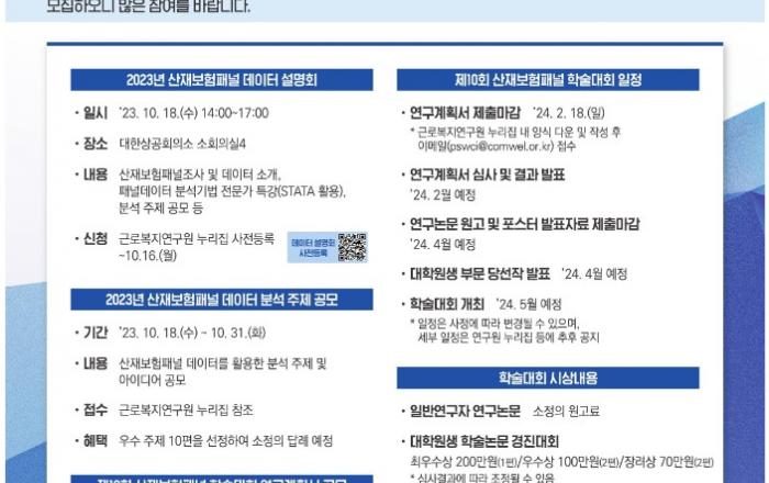 근로복지공단은 10월 18일(수) 오후 2시, 대한상공회의소에서 2023년 산재보험패널 데이터 설명회를 개최했다. 산재보험패널조사(2017년 국가승인통계 지정)는 산재근로자를 대상으로 하는 유일한 시계열 자료로, 공단은 2013년부터 산재근로자의 직업복귀, 일과 삶