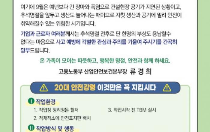 고용노동부는 9월 18일부터 10월 6일까지 3주간을 「추석 전후 산업안전보건 집중관리 기간」으로 설정하고 오늘(9.18.)부터 본격 관리에 들어간다. 추석 연휴 전·후에는 급한 마무리 작업, 기계·장비의 가동중지 또는 재가동, 관리감독자 또는 안전관리자의 휴가 등