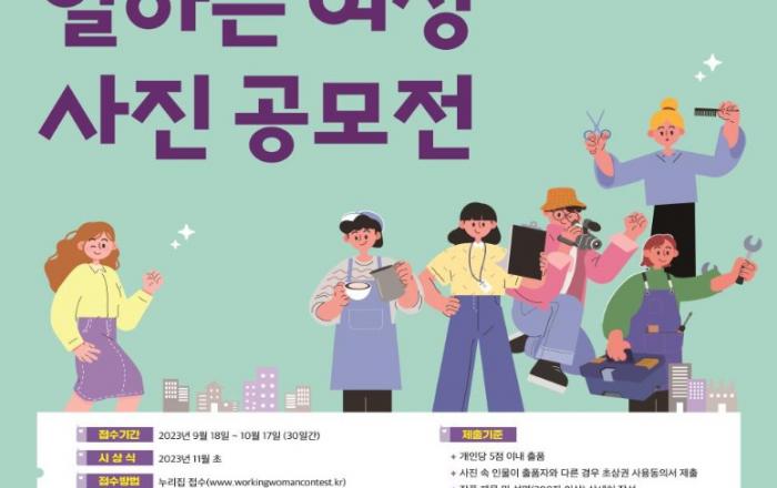 고용노동부는 9.18.(월)부터 10.17.(화)까지 한 달간 ‘일하는 여성 사진 공모전’을 개최한다. 이번 공모전은 워킹맘, 이색직업에 종사하는 여성 등 일하는 여성의 직업정신과 도전정신을 담은 생생한 사진을 통해 여성의 경제활동을 촉진하고 경력단절 없이 일할 수