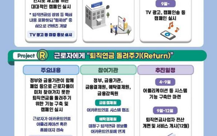 정부 및 퇴직연금 관련 유관기관 그리고 20개 금융기관(은행·보험·증권업 등)이 2023. 9. 20.(수) 오전 11시 30분 63빌딩에 모여 ‘퇴직연금 활성화를 위한 IRP 프로젝트 추진 업무협약’을 체결했다. IRP 프로젝트는 든든한 노후소득 보장을 위해 퇴직