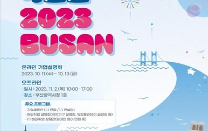 부산시와 부산경제진흥원은 오는 10월 18일까지 '해외취업 엑스포 2023 부산(BUSAN)' 참가 해외기업에 취업을 희망하는 '입사 지원자'를 모집한다고 밝혔다. '해외취업 엑스포 2023 부산(BUSAN)'은 오는 11월 2일 오전 10시 시청 1층에서 개최되며