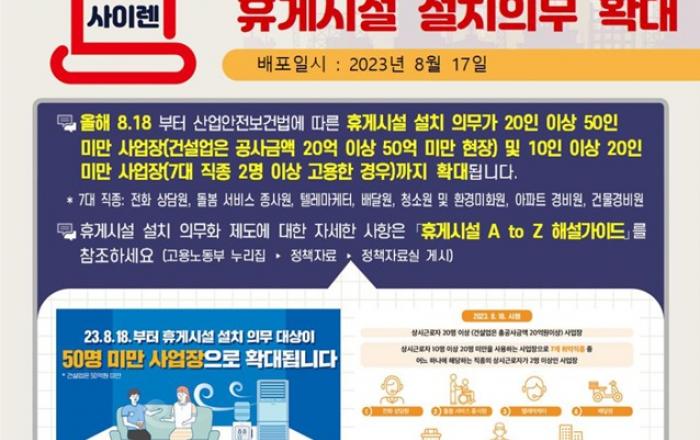 고용노동부와 한국산업안전공단는 8.18.(금)부터 시행되는 50인 미만 사업장(20인 이상)에 대한 휴게시설 설치 의무화 제도 확대와 관련하여 전국 48개 지방관서별로 캠페인을 실시한다고 밝혔다. 캠페인은 50인 미만 소규모 사업장이 밀집된 산업단지, 지식산업센터 및