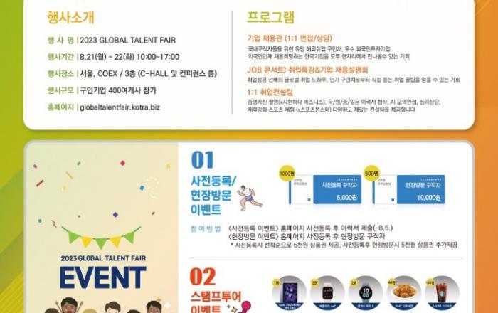 한국산업인력공단(이하 ‘공단’)은 코트라, 국립국제교육원과 공동 주관하는 ‘2023 글로벌 탤런트 페어(GLOBAL TALENT FAIR)’를 서울 코엑스에서 21일 개최한다. 글로벌 탤런트 페어는 ▲글로벌일자리대전 ▲외국인투자기업 채용박람회 ▲외국인 유학생 취업박