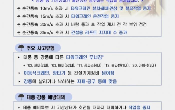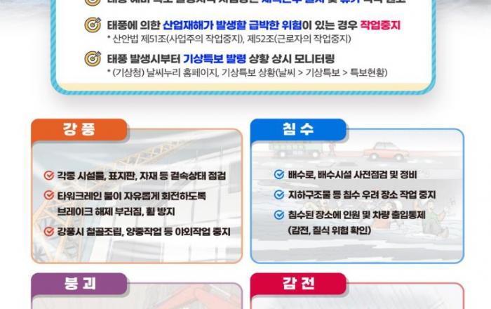 고용노동부는 1·2차 특별 현장점검의 날에 이어 8월 9일을 「태풍·폭염 대응 특별 현장점검의 날」로 지정·운영한다고 밝혔다. 기상청 예보에 따르면 제6호 태풍 ‘카눈’이 8월 9일부터 11일까지 전국에 영향을 미치고, 특히 이동경로에 있는 경상·강원 지역에 피해가 집
